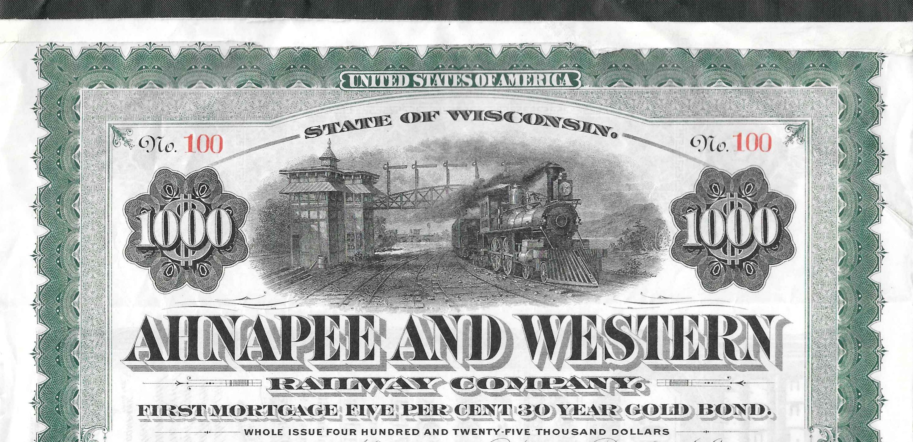 The bond pictured above was printed by the American Bank Note Company and issued in 1906. Although it was intended as a thirty-year bond, it was not redeemed until 1942. The central vignette is a stock image used by ABNC and is not a representation of any portion of the railway’s tracks.