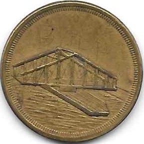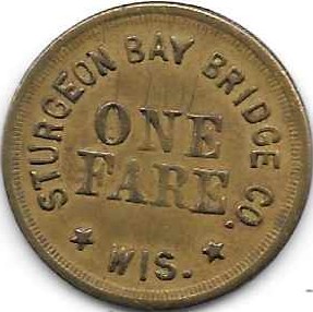 In Sturgeon Bay, the Ahnapee & Western crossed the bay on the toll bridge that had been built in 1887 by the Sturgeon Bay Bridge Company. The Bridge Company had a twenty-five year charter to operate the bridge. The tokens above were used for tolls on the bridge. The aluminum token on top was replaced by the brass token. Tokens in denominations of ten and fifteen cents are also known to exist but are very scarce. Paper chits were also used for the bridge. The representation of the bridge on the tokens is a simplified version of the span of the swing bridge in Sturgeon Bay.