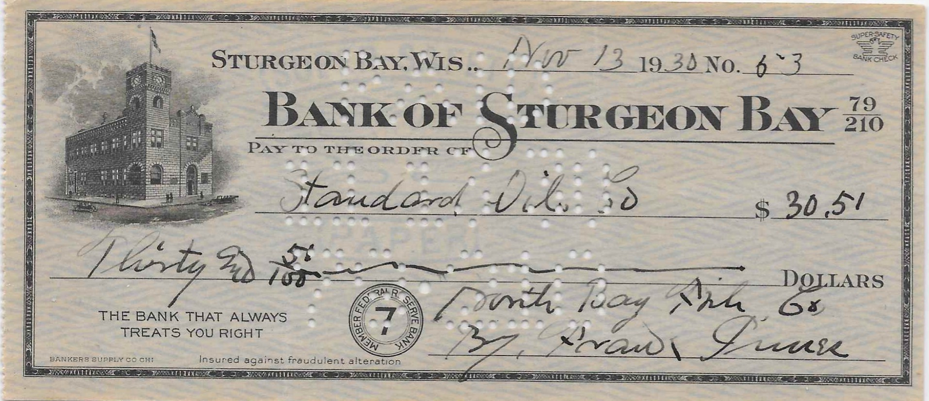 This next check was written in 1930 by the North Bay Fish Company. North Bay is located in the Town of Baileys Harbor about half way up the peninsula on the Lake Michigan side. The bank building is featured in the vignette at left. The building still stands although the clock tower was removed in the 1930s for safety reasons. The current bank location is two blocks away.