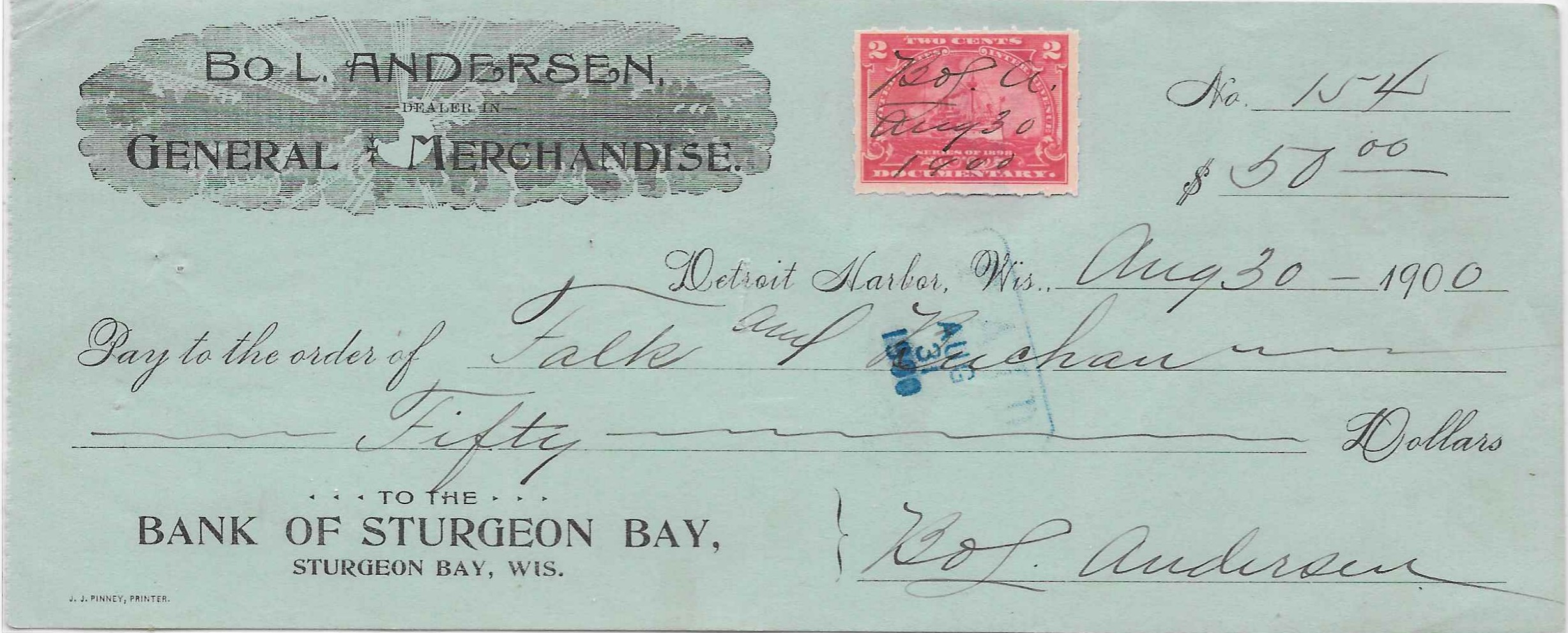 Andersen operated a general store on Washington Island off the northern end of the peninsula. The check has identifies his location as Detroit Harbor, Wisconsin which is the site of the island dock for the Washington Island Ferry. The payee is Falk & Buchan, a seed seller in Sturgeon Bay.