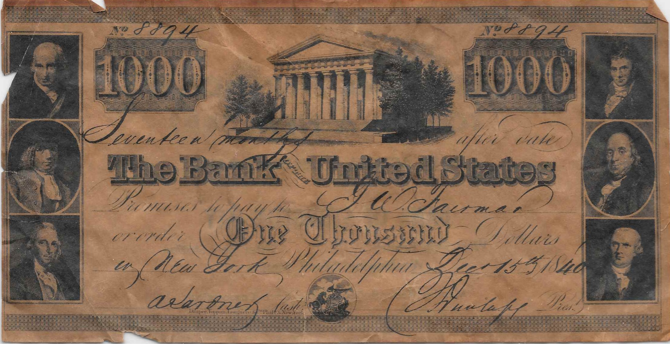 Paper money collectors will recognize this facsimile of a $1,000.00 post note issued by the Bank of the United States in 1840 with serial number 8894. It was an often duplicated piece used for advertising as it was here by the Bank in 1967.