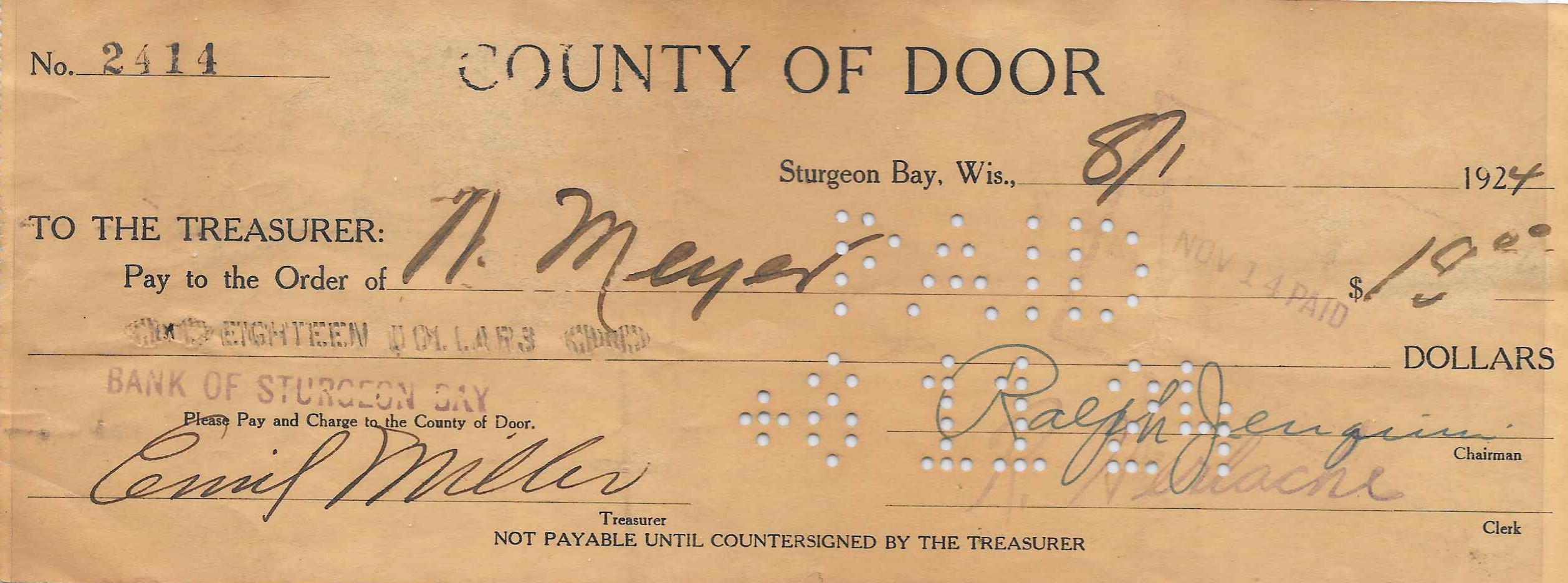 This check for $18.00 was written in 1924 by the Door County Treasurer and payable at the Bank of Sturgeon Bay. The multiple endorsements on the back shows the practice of passing negotiable instruments from holder to holder to pay debts. The check was written on August 1 and cleared the Bank of Sturgeon Bay on August 11 (shown by the perforated date). During that time it passed through five different hands.