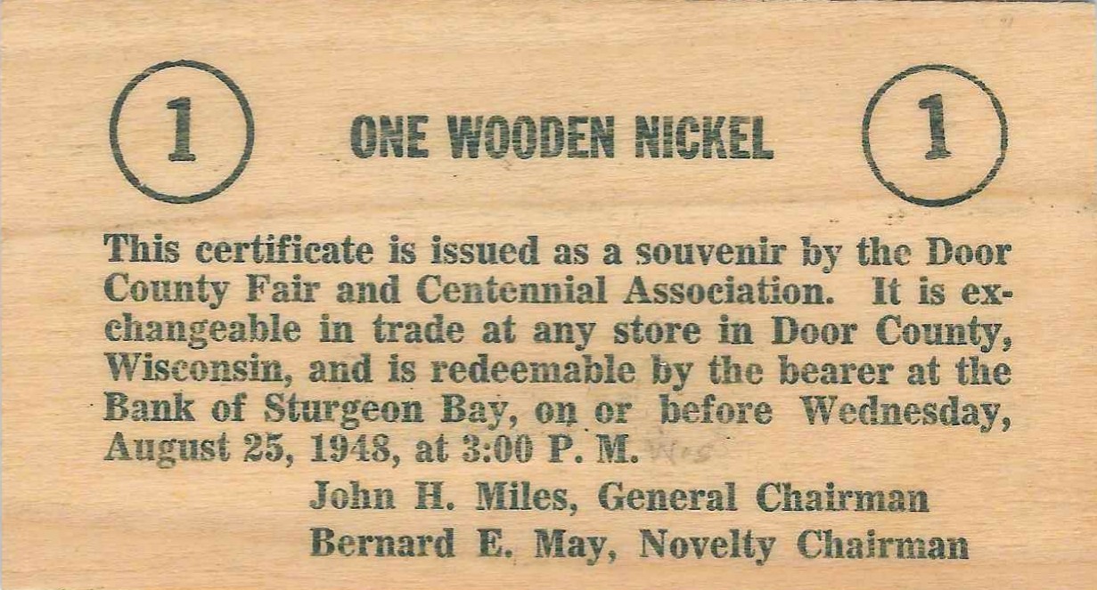 Door County celebrated its centennial in 1948. This wooden nickel is one of a series of three that were issued to mark the occasion. The others being worth two nickels and five nickels. It is redeemable at the Bank of Sturgeon Bay. Wooden nickels were popular souvenirs in the 1930s-50s. A not very accurate map of the county appears on the face.