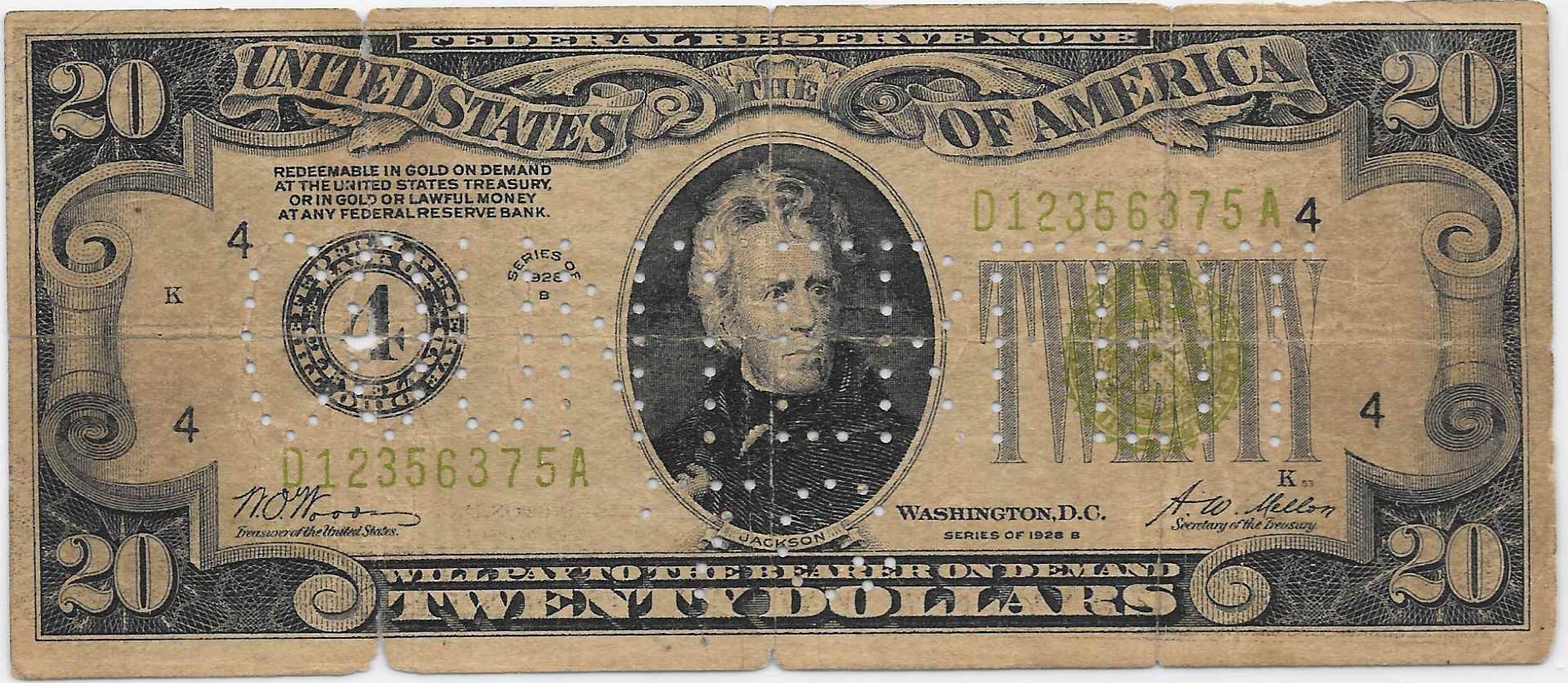 This final piece is not mine but belongs to a colleague. It is a counterfeit 1928B $20.00 Federal Reserve Note from the Cleveland Fed. The notation on the back indicates it was found at the Bank of Sturgeon Bay on July 22, 1936 and received by the Federal Reserve Bank (probably Chicago as Sturgeon Bay is located in the Chicago Federal Reserve District) the next day. The paper is not close to being correct and the aging of the note was artificial. The counterfeiters made a glaring mistake when they printed this note. The Federal Reserve Bank seal on the left side of Series 1928 and Series 1928A $20.00 notes had large numerals in them as this note does. But the design was changed for Series 1928B so that the corresponding capital letter appears in the seal (in this case D for the Cleveland Federal Reserve Bank).