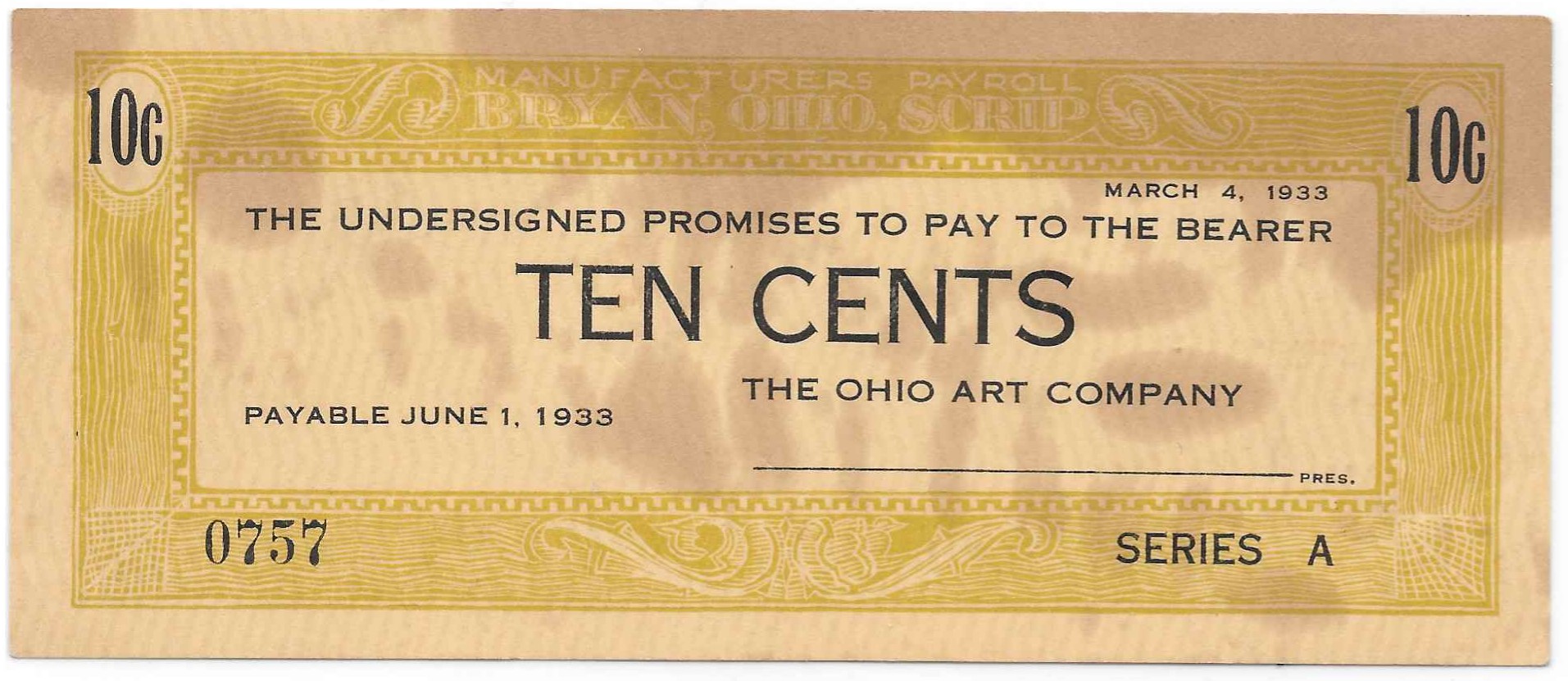 March 4, 1933 was a Friday and with many banks already closed, scrip was necessary to make the payroll. In Bryan, OH, the businesses that could not make their payroll had a uniform style scrip printed that carried the name of each issuing business.
