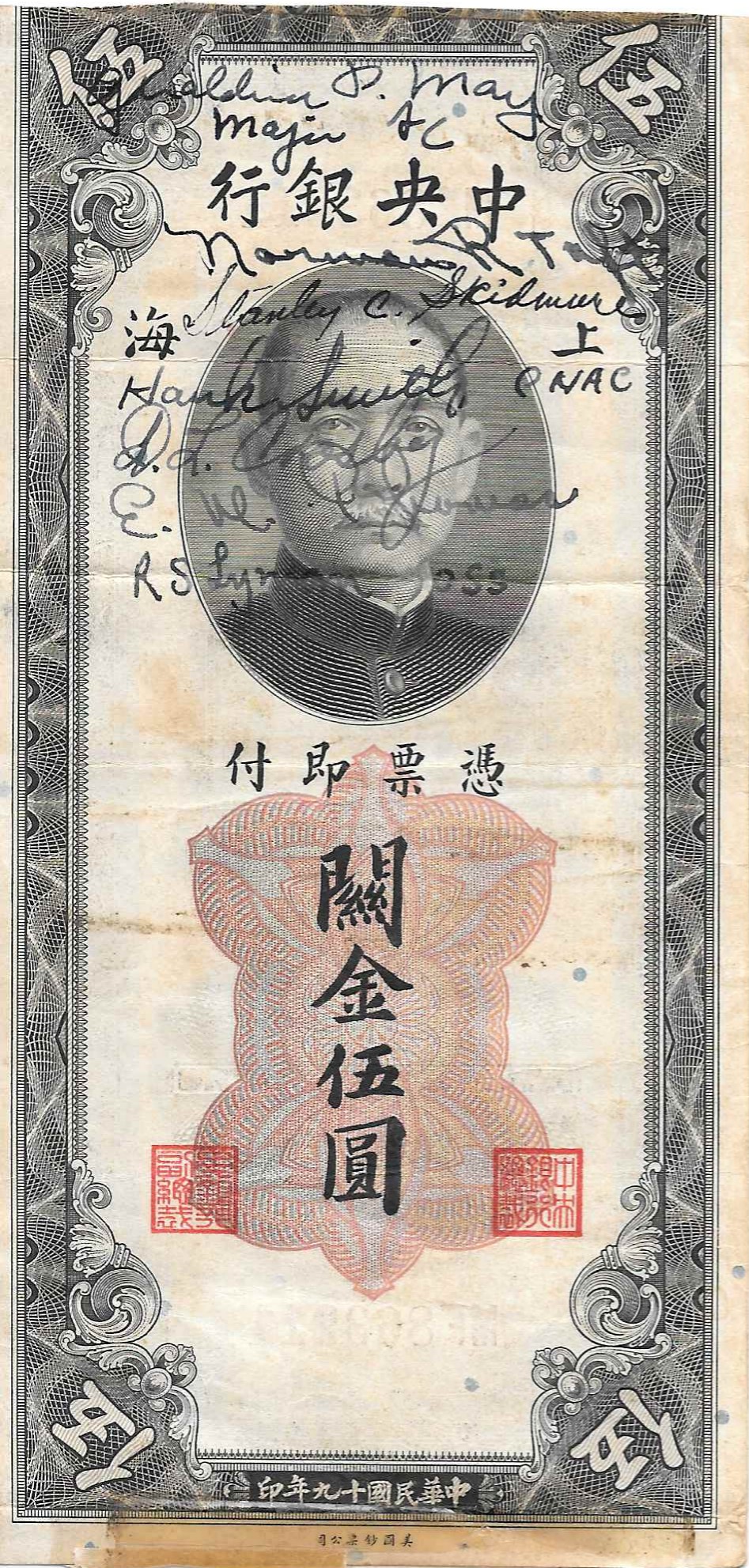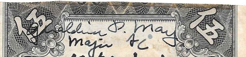 This first item is a short snorter on a Central Bank of China 10 customs gold units note. The first signature on the note is Geraldine P(ratt) May, Major, A(ir) C(orps).