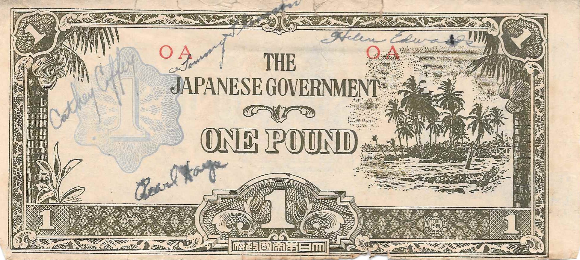 This next piece is also a short snorter with the signatures of four different women. The underlying note is an Australian made counterfeit of the one pound note issued by the Japanese for their occupation of Oceania. Three of the four signatures are positively identified.