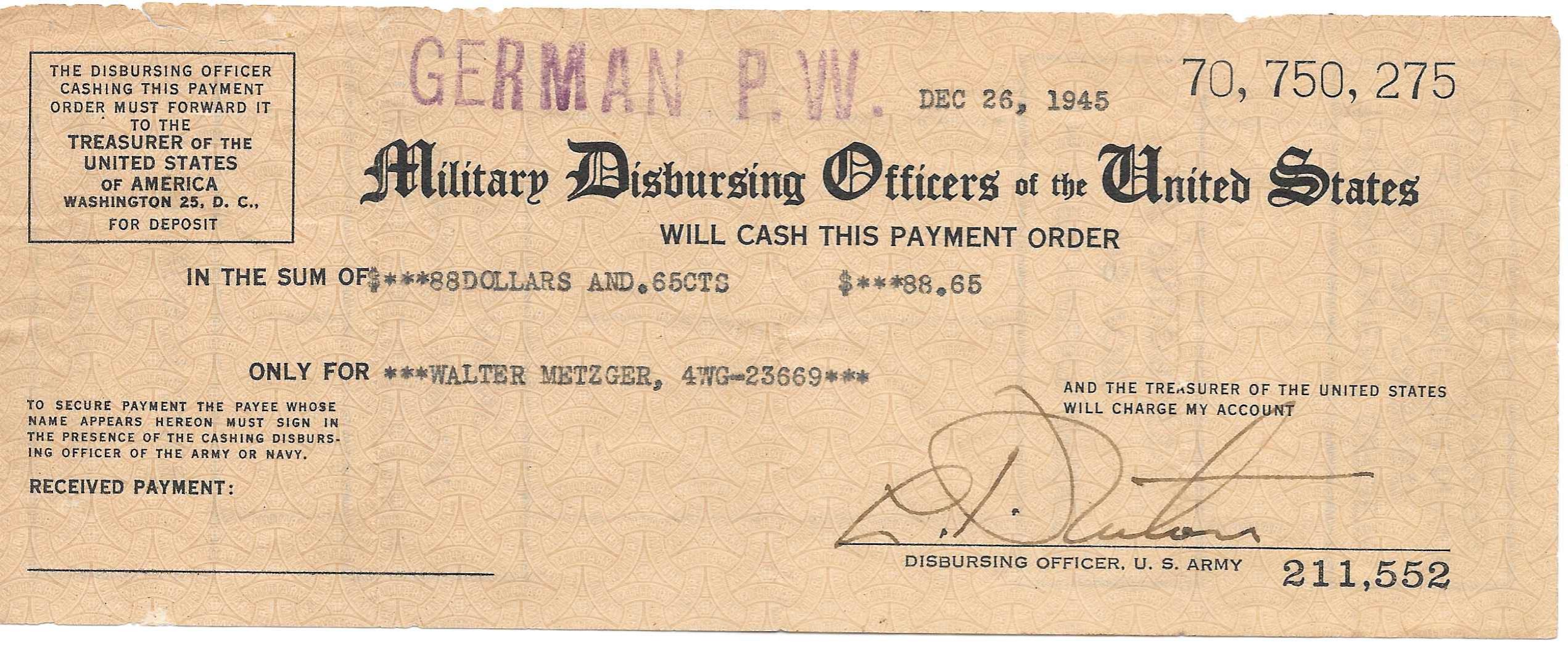 Prisoners could accumulate a significant amount of money during their captivity. Upon repatriation they received a check in the amount of the balance of their account. Although the checks were denominated in US dollars, they could only be cashed by US military disbursing officers overseas. This was done for two reasons.