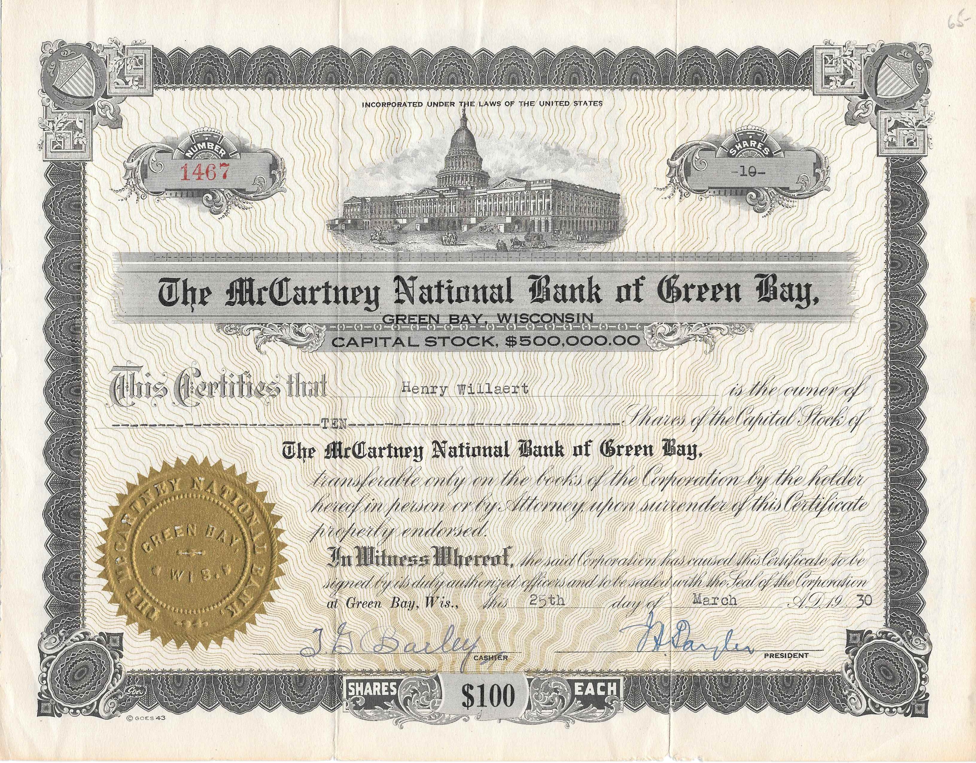 The McCartney Exchange Bank was founded as a state bank in 1882 by David McCartney in Fort Howard, Wisconsin (presently the west side of Green Bay). It was incorporated as a national bank in 1892 as the McCartney National Bank of Fort Howard receiving charter number 4783. Three years later when the borough of Fort Howard was married to the city of Green Bay the bank changed its name. McCartney was lured to Wisconsin from Ohio by the lumber industry and operated two saw mills near Green Bay before investing in pine lands in Georgia.