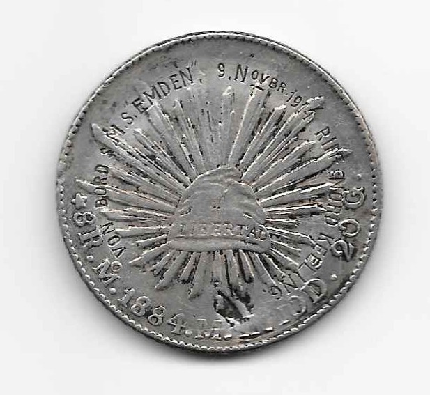 At least one German also made a souvenir out of a Mexican Peso inscribing the piece shown above with the legend “Von Bord S.M.S. Emden 9 Novbr 1914 Riff Nord Keeling”.