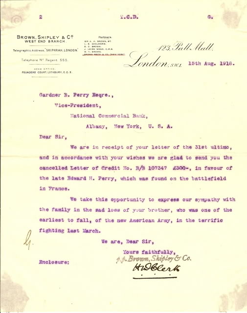 Despite the eyewitness account of 1LT Perry’s death, his remains were not identified and the American Battlefield Monuments Commission lists him as missing in action. Curiously, the letter of credit was found somewhere in the French countryside and returned first to Brown, Shipley & Co. and then to his family.