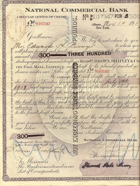 Prior to departing the United States, 1LT Perry got his financial affairs in order and took out the above letter of credit for £300. This amount was the equivalent of $1,500.00 in 1917. Letters of credit were a precursor to travelers’ cheques that allowed the holder to draw funds from an in-country financial institution which was reimbursed by the issuing bank. Amounts paid out are entered on the back.