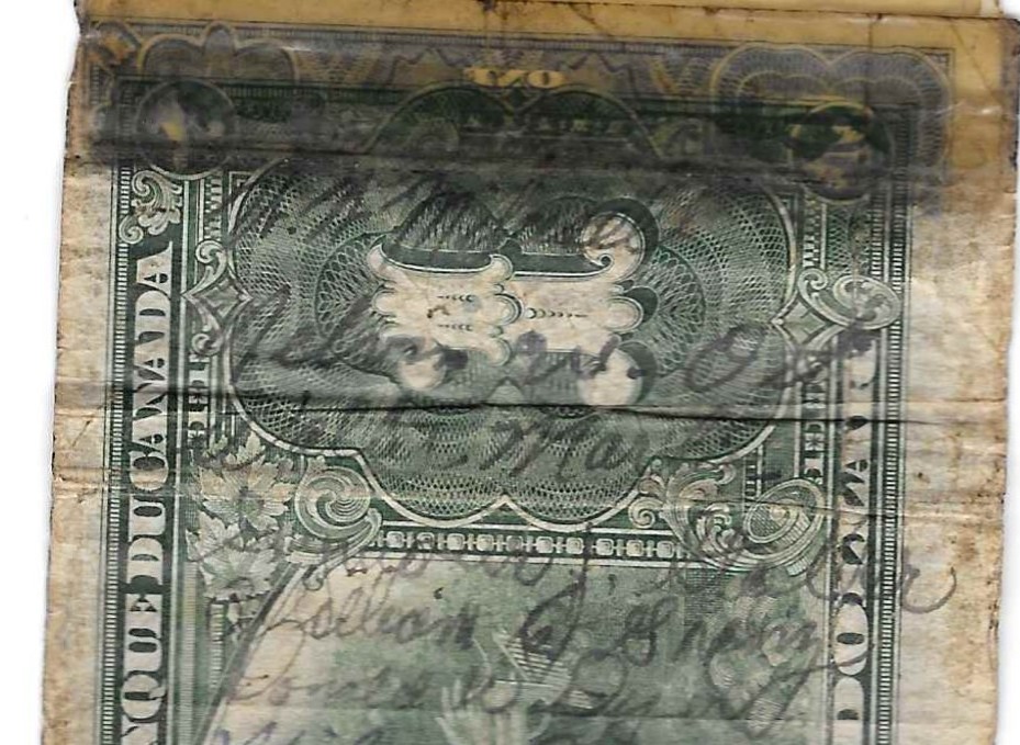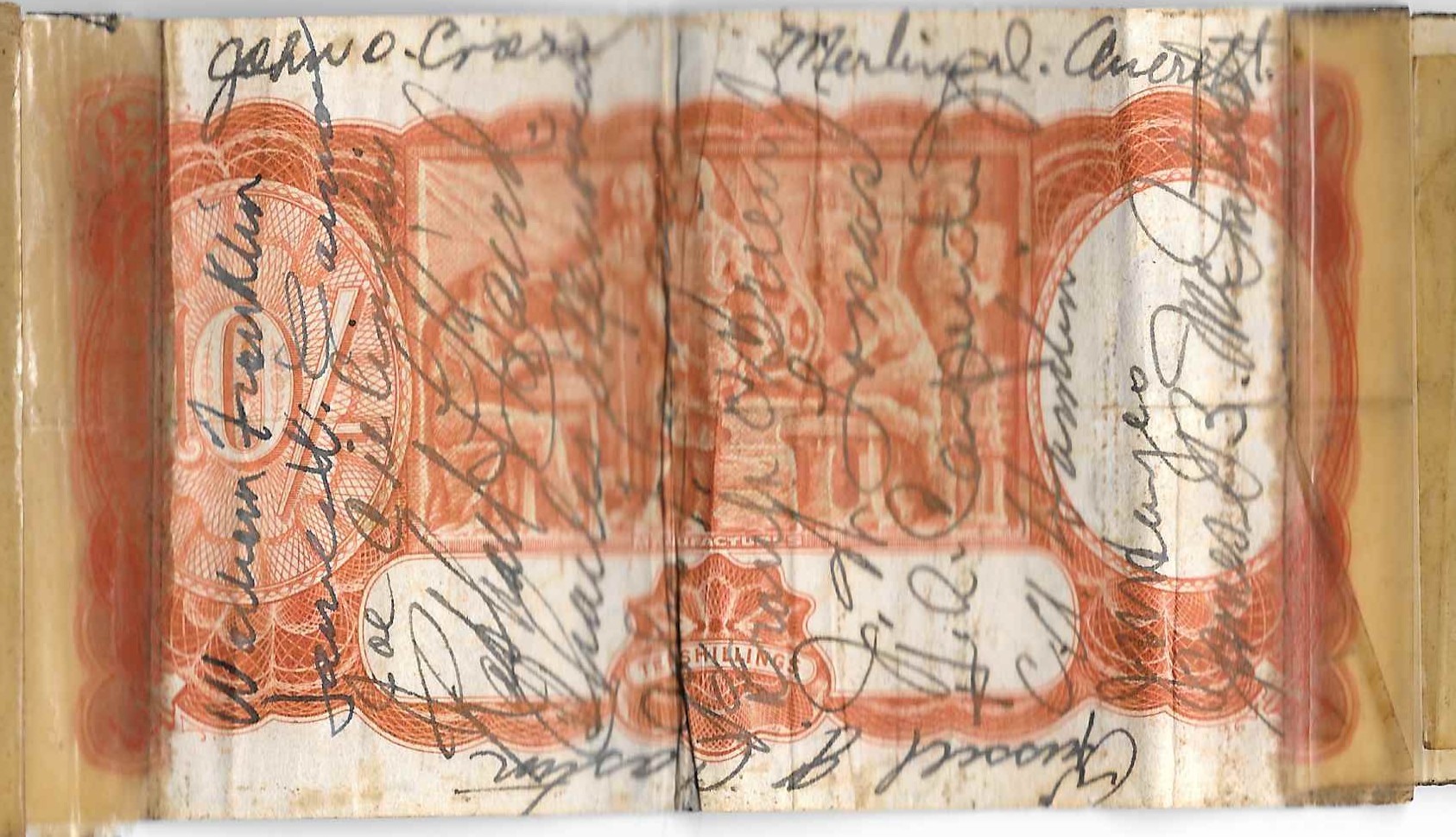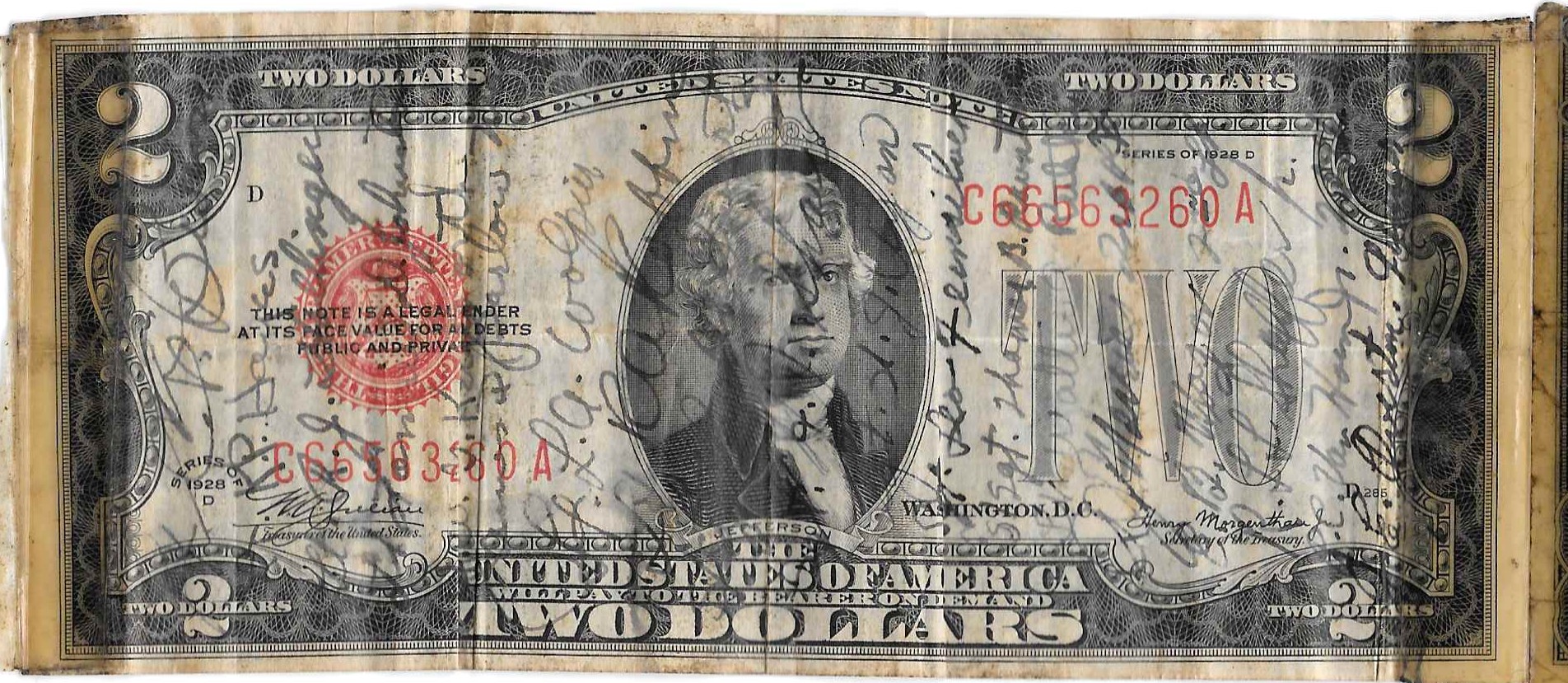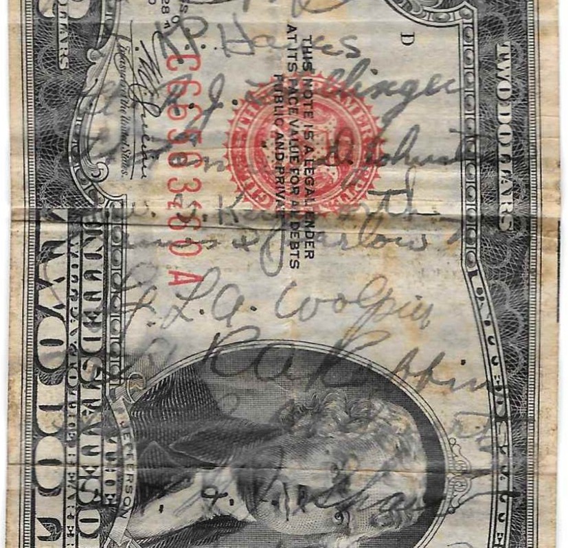 Short snorters were popular souvenirs in WWII. A short snorter is a banknote that was signed by a group of people usually to mark an event. They started before the war as souvenirs for passengers on trans-oceanic flights. Air crews continued the practice dung the war and it was picked up by the other branches.As service members traveled from country to country their short snorters would grow by taping notes from the different countries together. The short snorter is a remembrance of those a service member came in contact with and of those who would not return.