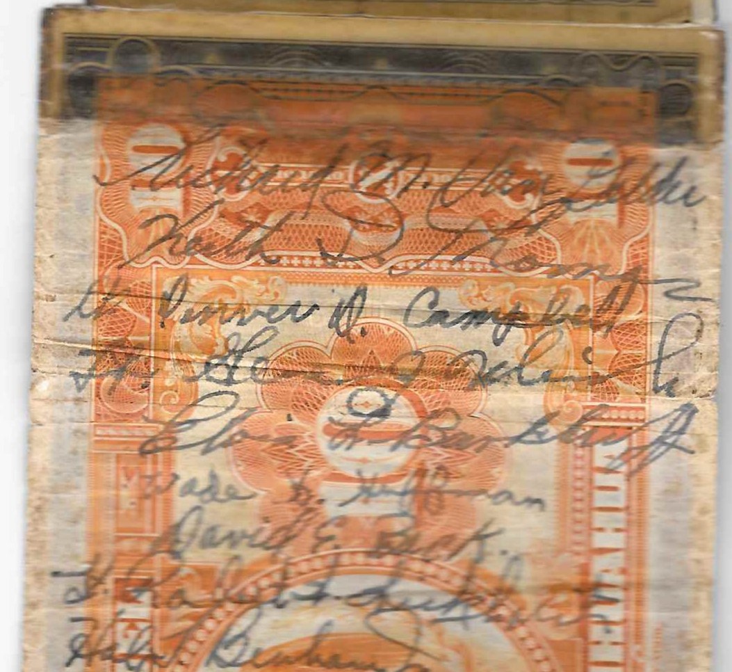 On April 28, 1944, 2Lt. Edmund J. Donai piloted his B-24 during an attack on Woleai Island. During the attack number 3 engine ceased operating and number 4 engine suffered a loss of oil pressure. Number 4 eventually failed and since it could not be feathered the aircraft began losing altitude quickly. A water landing was made and the aircraft remained intact. Five of the eleven crew members perished including Lt. Donai, Co-Pilot Lt. Richard J. Hollinger, Bombardier Lt. Lonnie D. Johnston, Radio Operator TSgt William D. Gand, and Photo gunner Robert T. Atsatt. Hollinger and Johnsron are on the short snorter along with survivors Navigator Lt. Kenneth F. Hayes, Engineer SSgt. Bernard A. Swartz, and Assistant Radio Operator Sgt. Howard J. Shaw.
